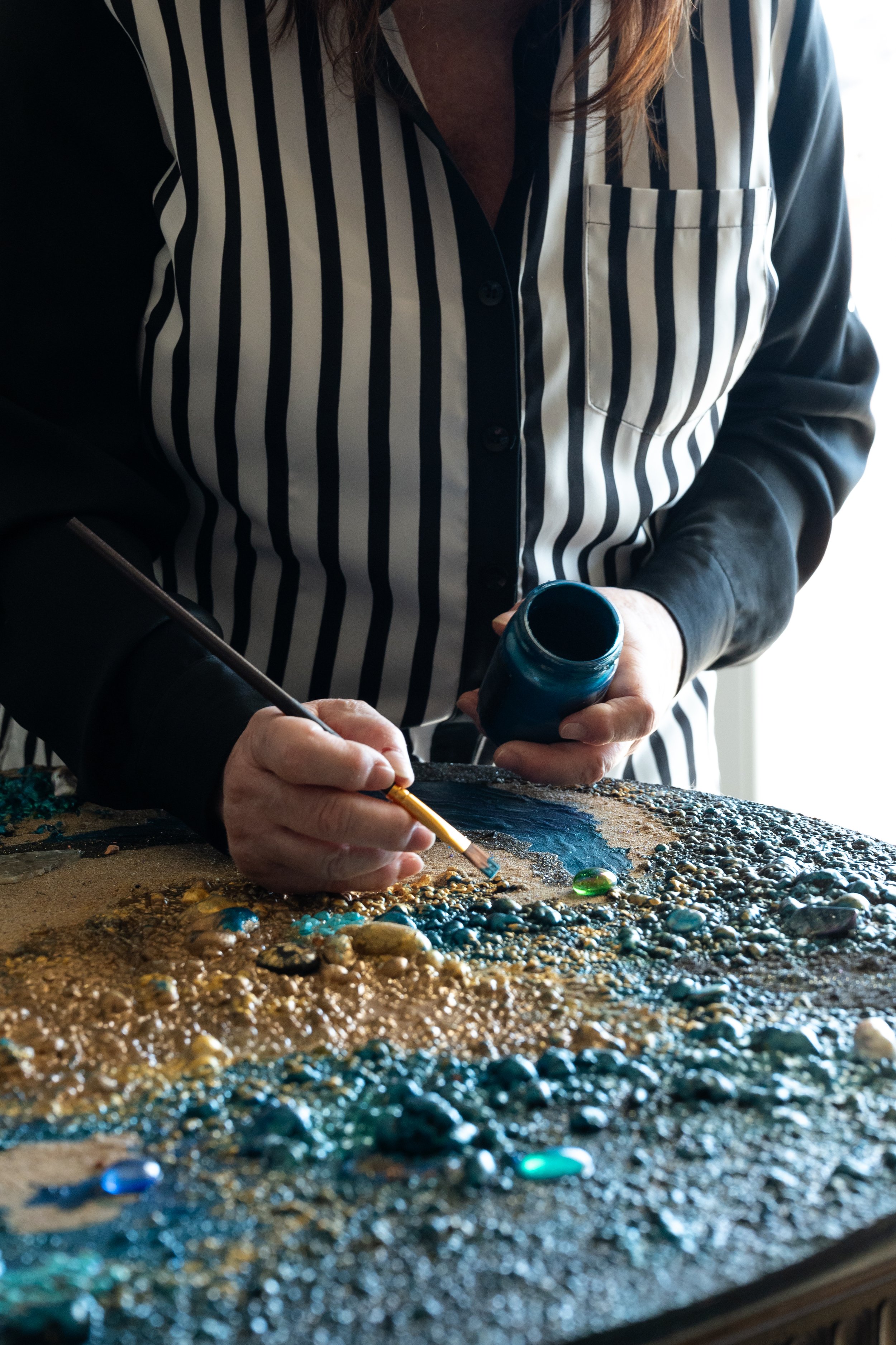 Ogni creazione su tavola di legno è dipinta a mano e arricchita di tanti materiali tra cui pietre dure, cristalli, falde di gesso, sabbie di isole greche, perle di fiume Scaramazze e altro ancora. Ogni opera e numerata e corredata di certificato di autenticità.